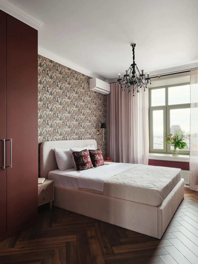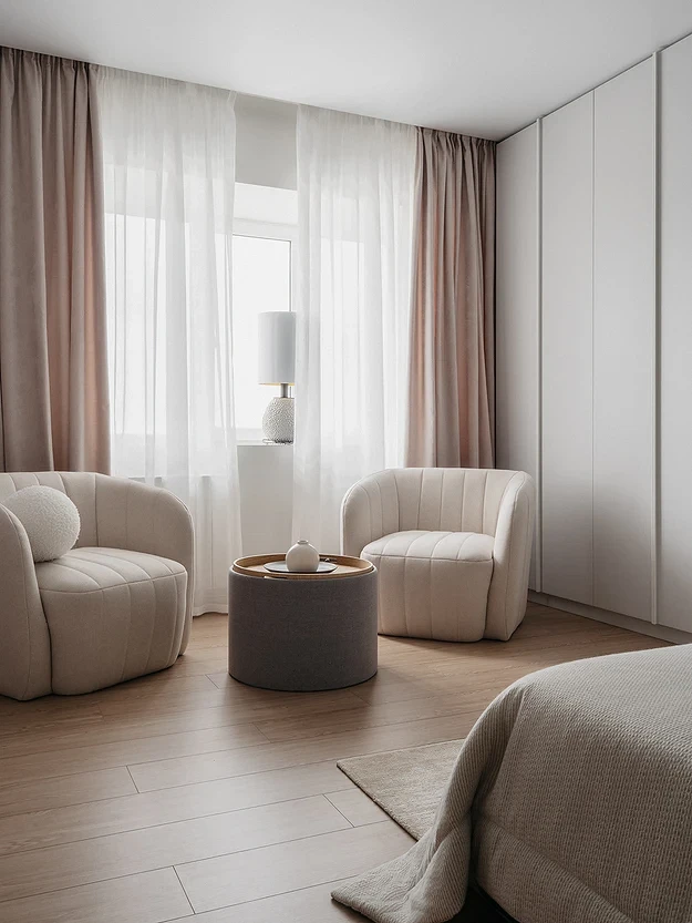 Светло-розовые, лавандовые, персиковые и мятные оттенки придают спальне лёгкость и мягкость. Идеальны для светлых интерьеров, где нужно создать аккуратный цветовой акцент без перегрузки пространства.