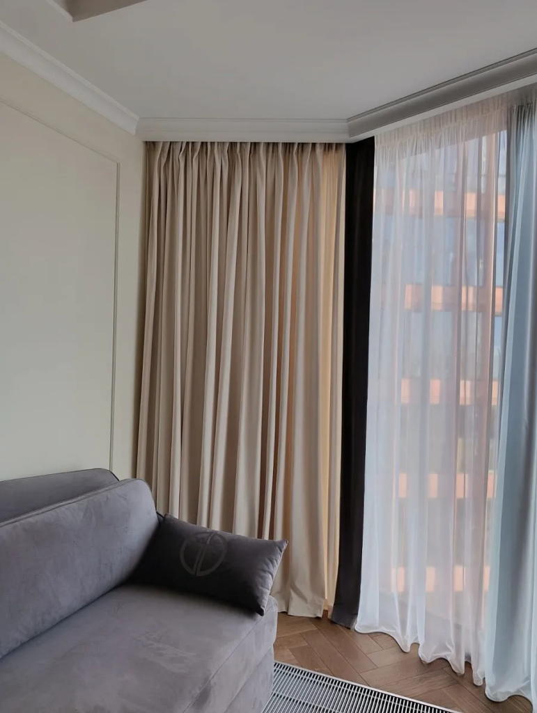 Одновременно развивается тренд на многослойность: сочетание тюля с блэкаутом или декоративного слоя с функциональным позволяет гибко управлять светом и атмосферой в течение дня.